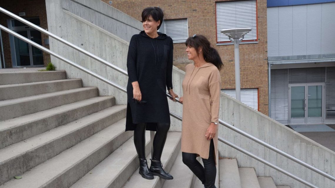 Supermyk kjole i to farger med lekre detaljer. Kan brukes som kjole eller med en smal bukse under. Klikk deg inn i nettbutikken eller besøk oss i den lille MB-butikken for å se flere av høstens kjoler.