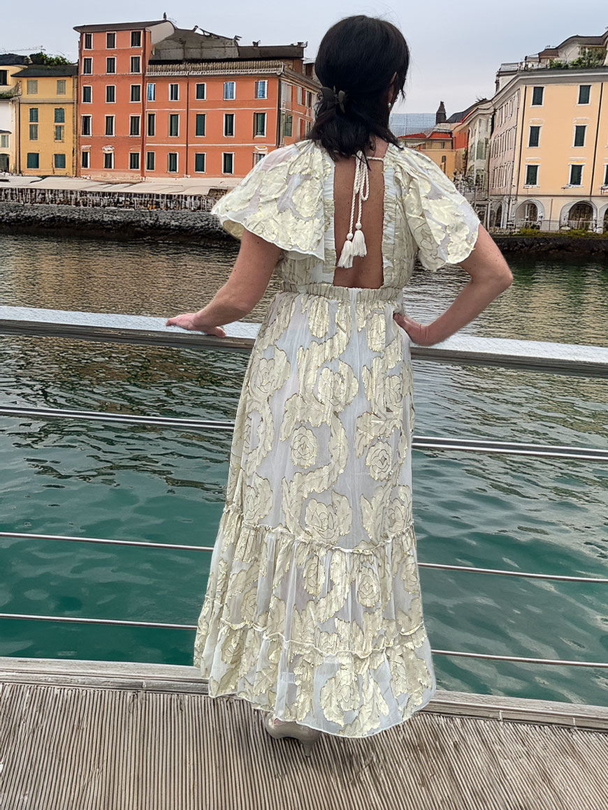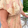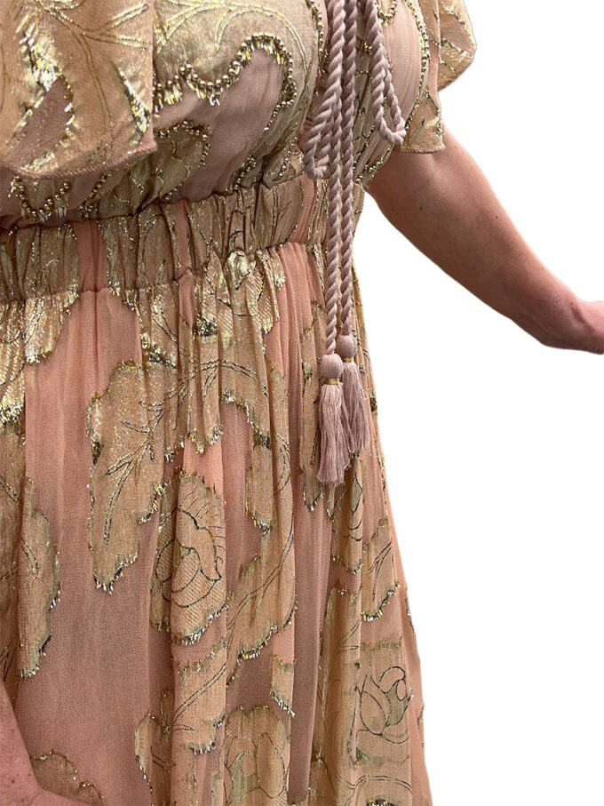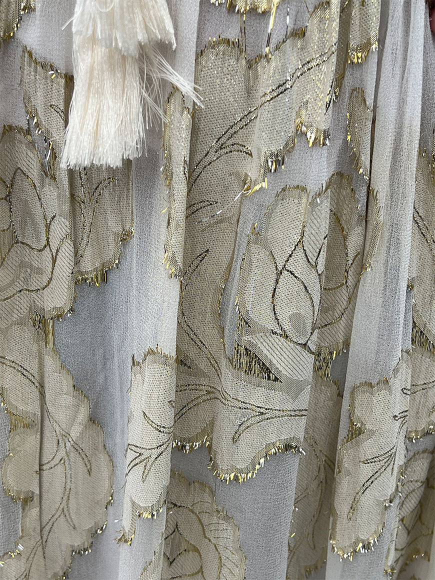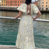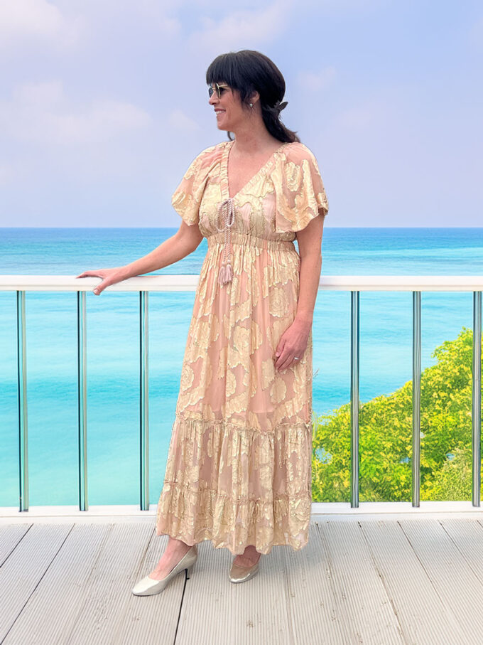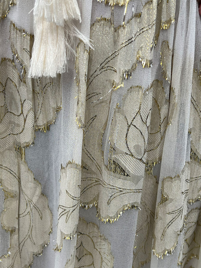 Kjolen er laget i myk og behagelig viscose som faller lett og flatterende på kroppen. Overdelen er dekorert med delikate broderte gulleffekter i tyll som gir et luksuriøst og unikt uttrykk.