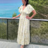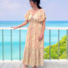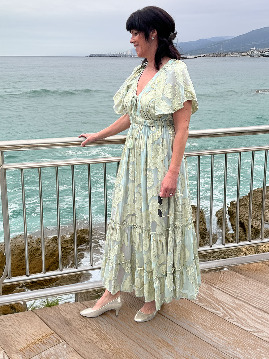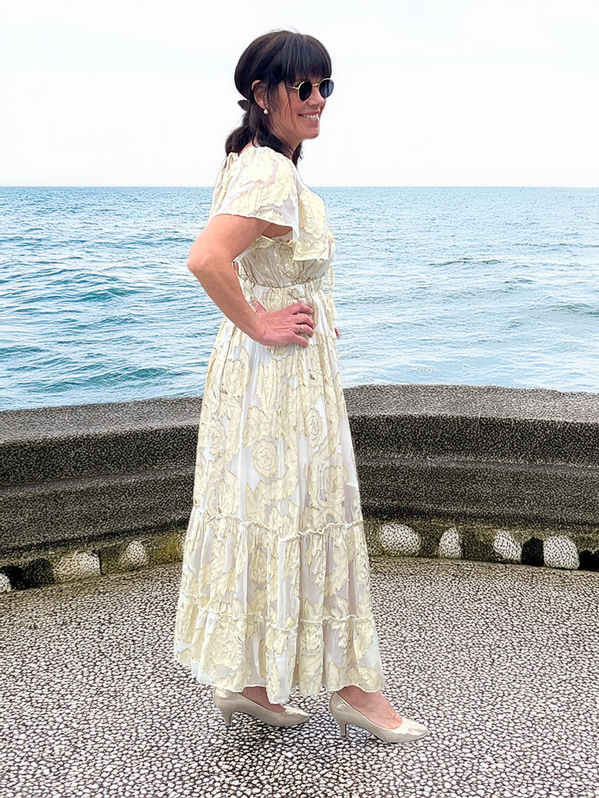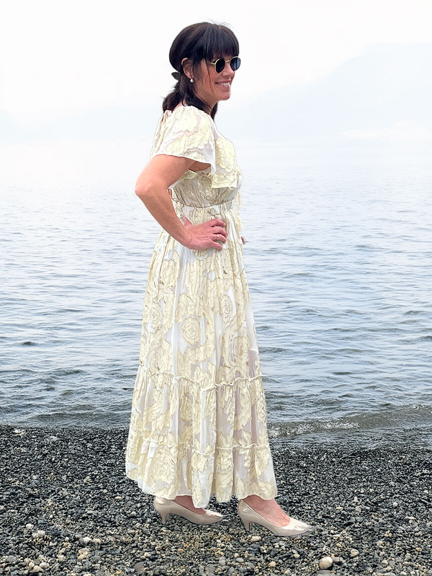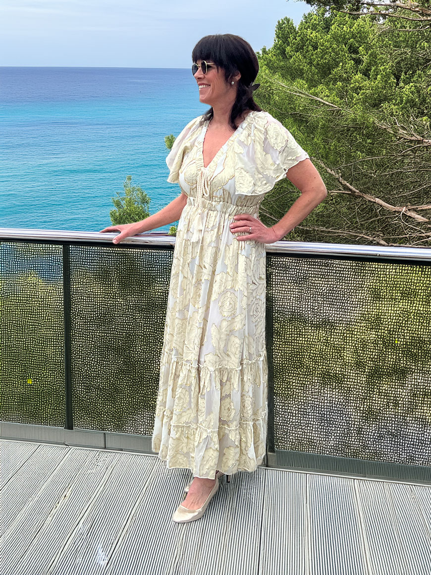 Kjolen er laget i myk og behagelig viscose som faller lett og flatterende på kroppen. Overdelen er dekorert med delikate broderte gulleffekter i tyll som gir et luksuriøst og unikt uttrykk.