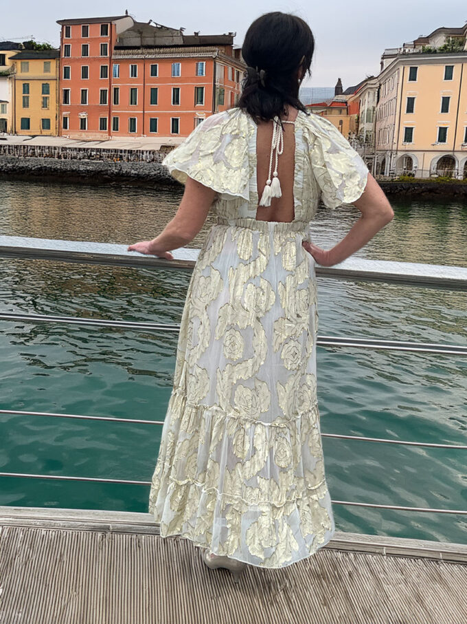 Denne elegante festkjolen kommer i tre nydelige farger og er designet for å gjøre inntrykk. Den har vakre gulldetaljer som gir et eksklusivt preg, kombinert med en feminin, åpen rygg som skaper en sofistikert og festklar silhuett.