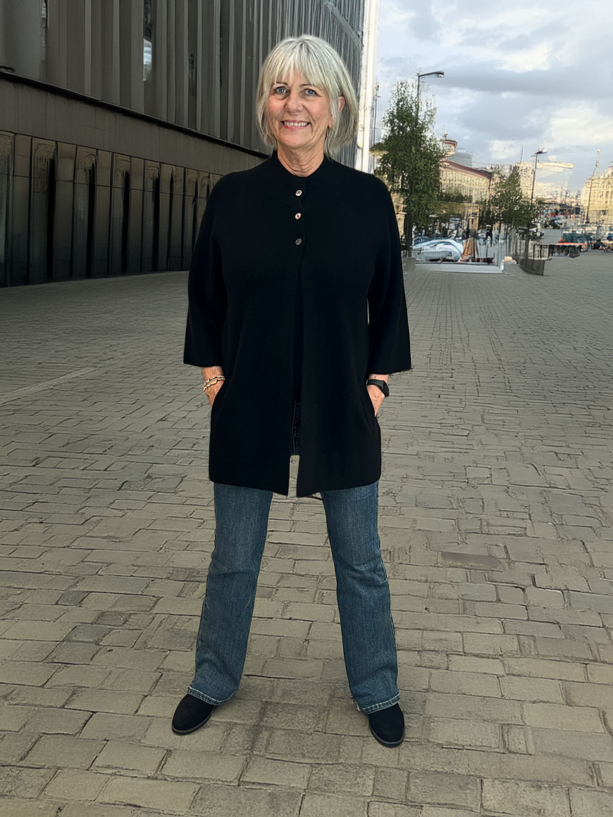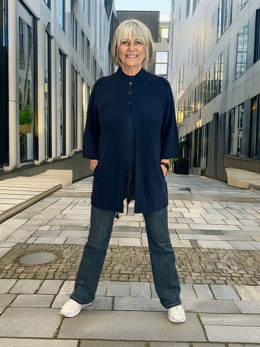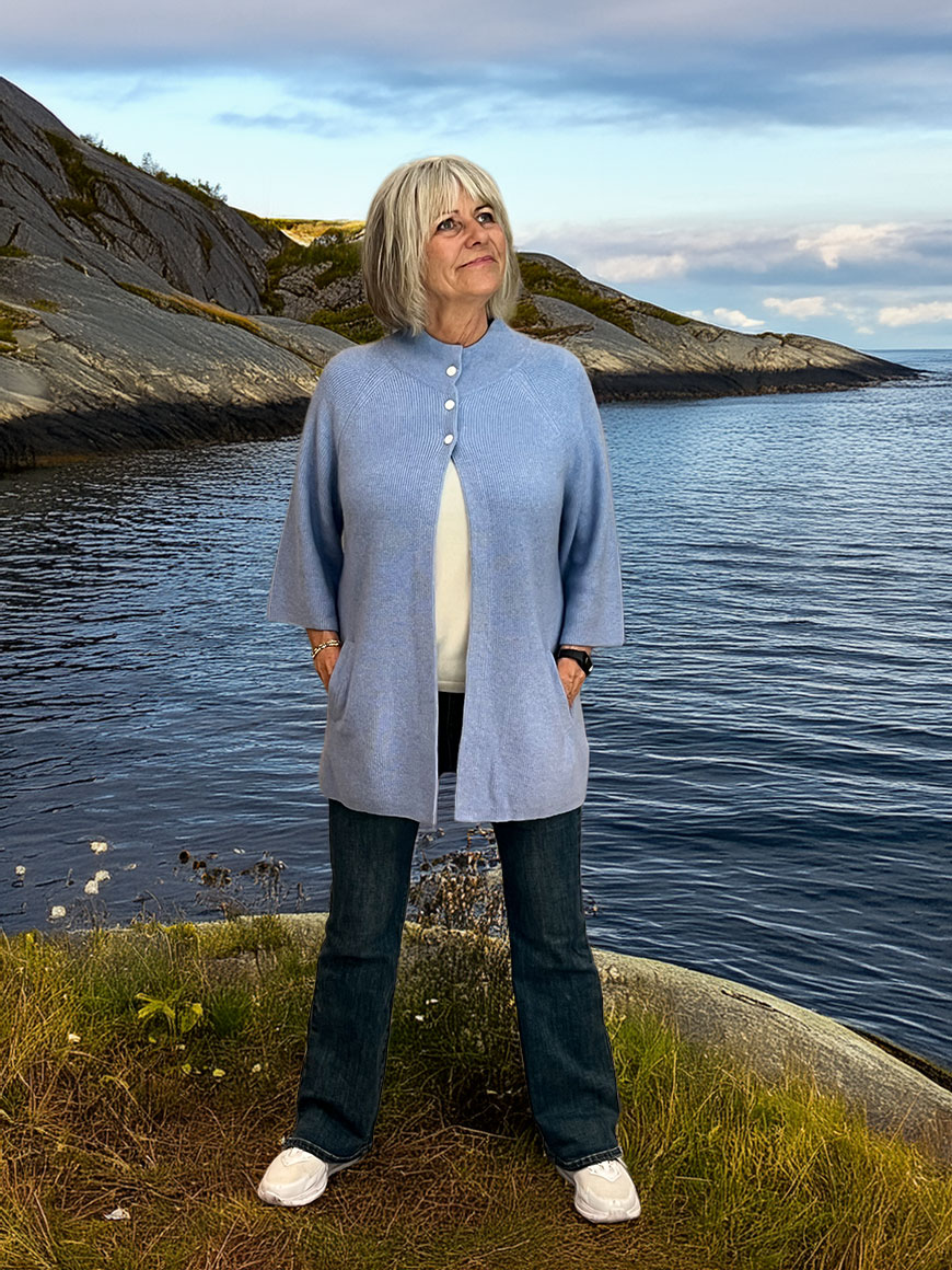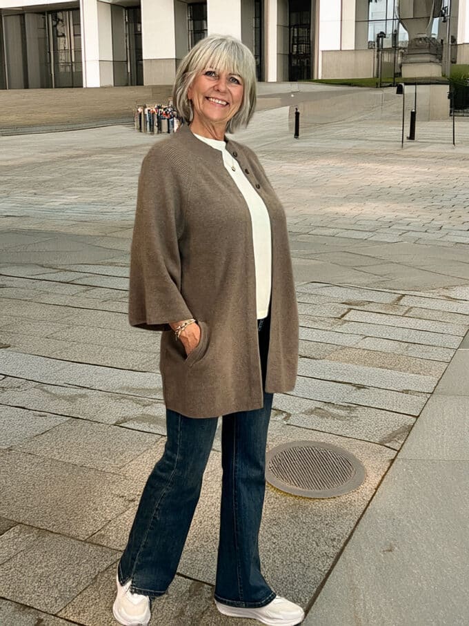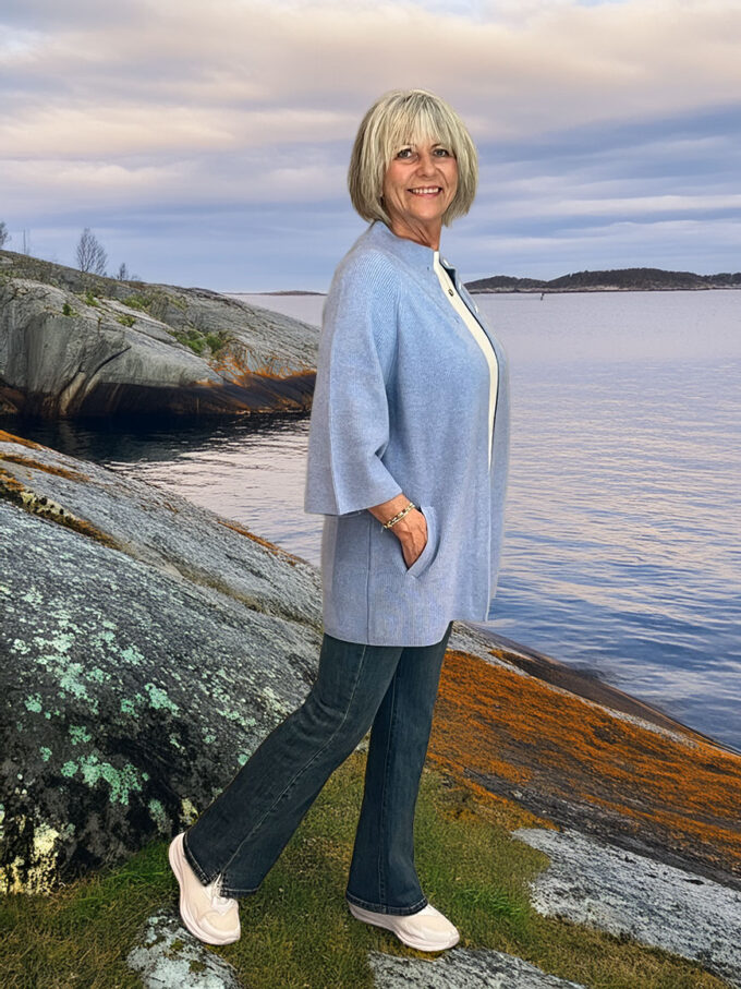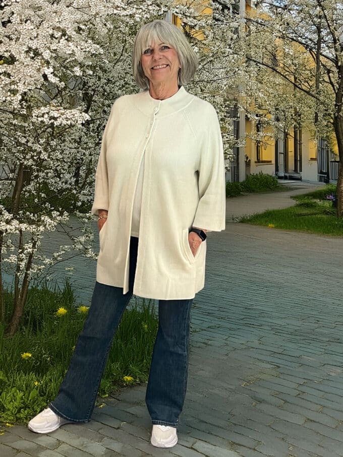 Med rund hals og tre dekorative knapper får cardiganen et tidløst uttrykk, mens de praktiske lommene gir funksjonalitet. Den lange passformen gjør den enkel å style – bruk den over kjole for et feminint preg, eller kombiner med jeans for en avslappet, men sofistikert look.