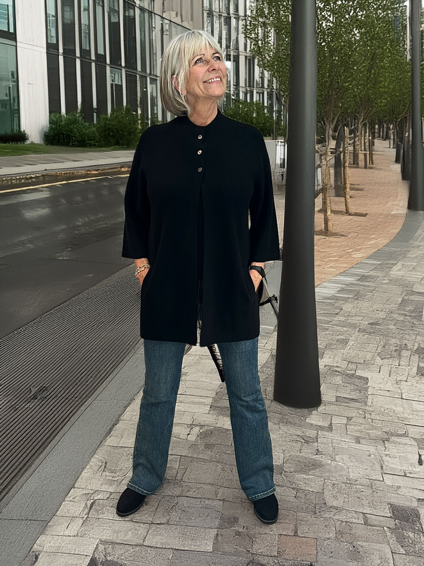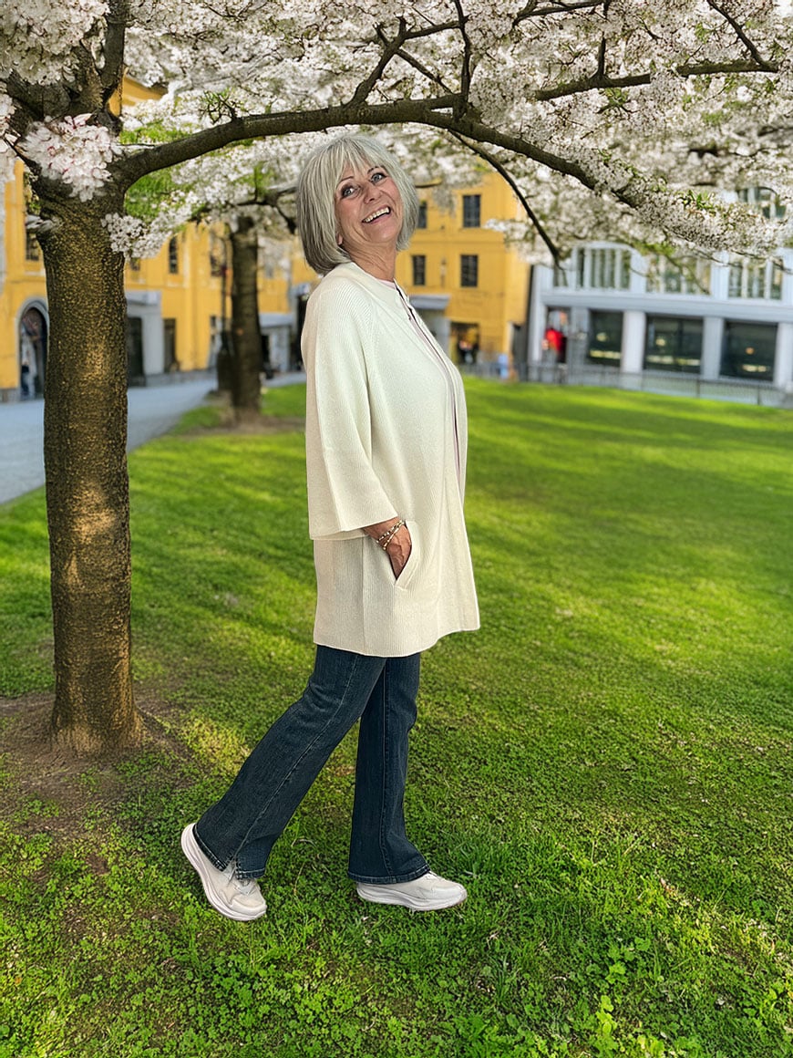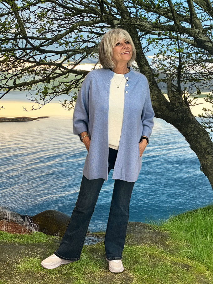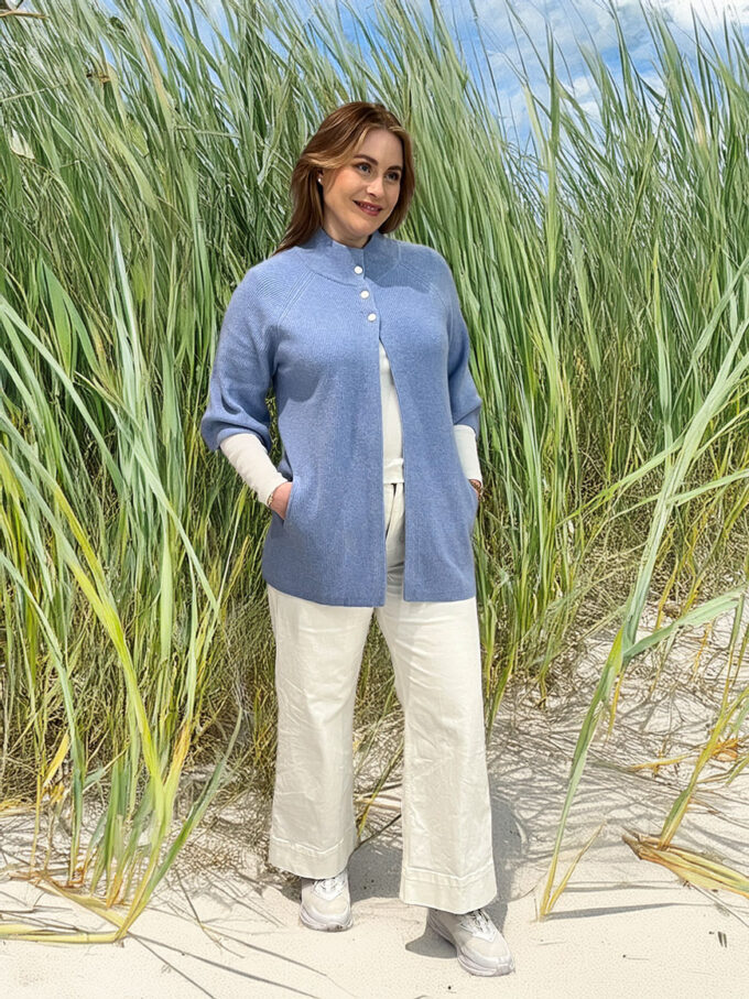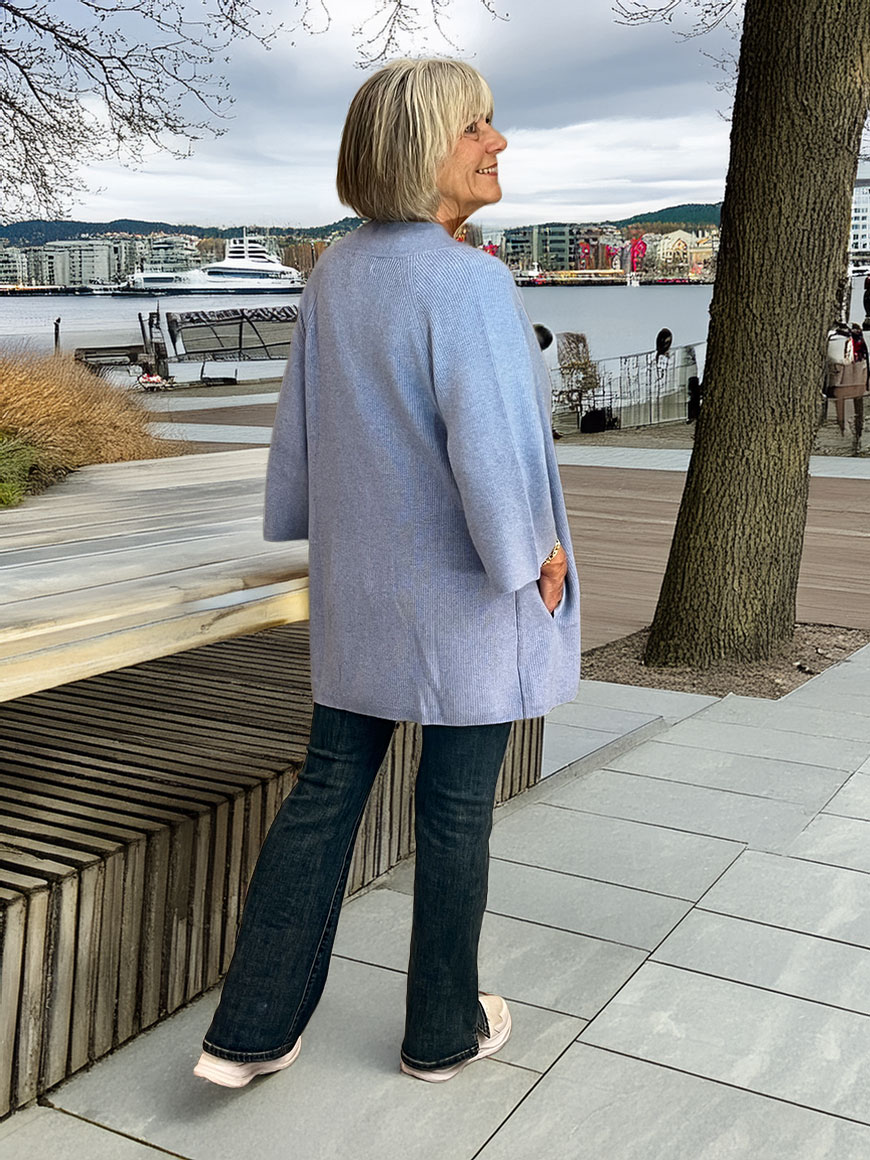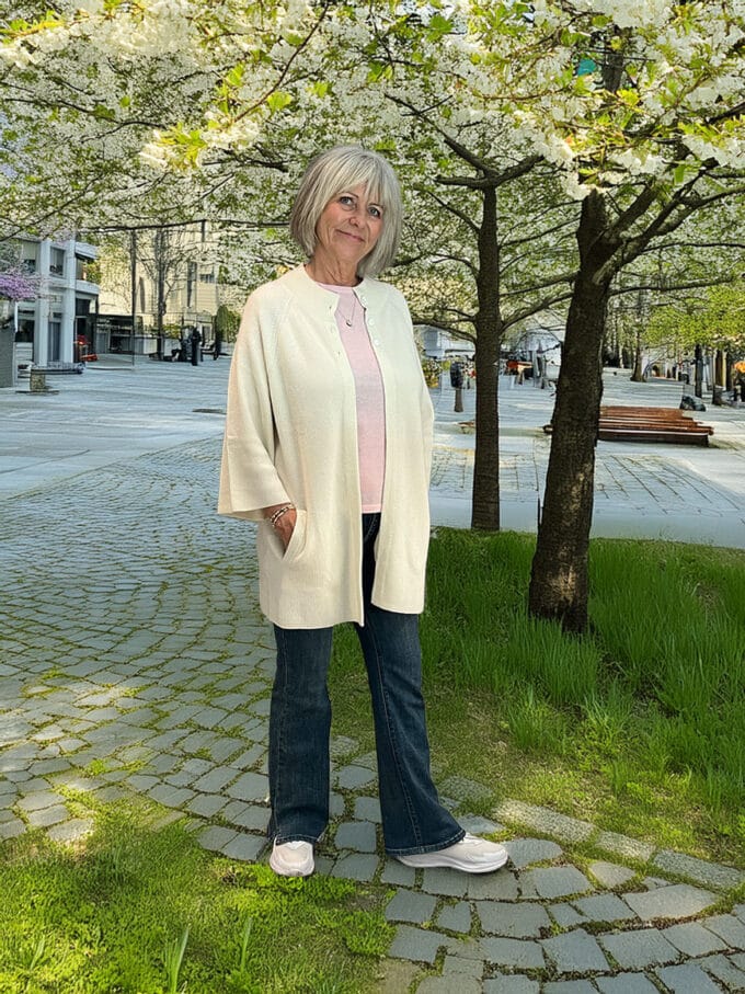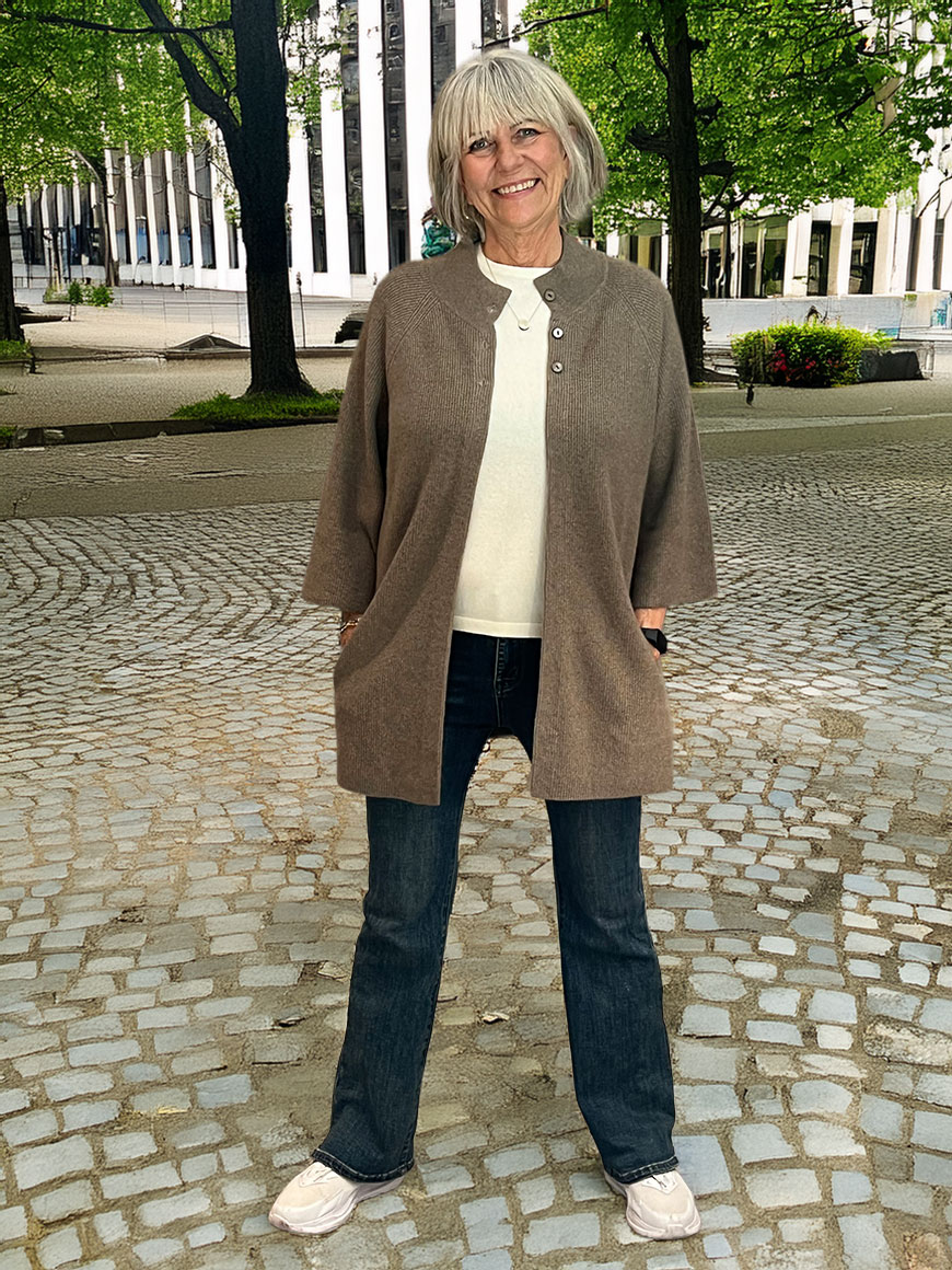 Med rund hals og tre dekorative knapper får cardiganen et tidløst uttrykk, mens de praktiske lommene gir funksjonalitet. Den lange passformen gjør den enkel å style – bruk den over kjole for et feminint preg, eller kombiner med jeans for en avslappet, men sofistikert look.