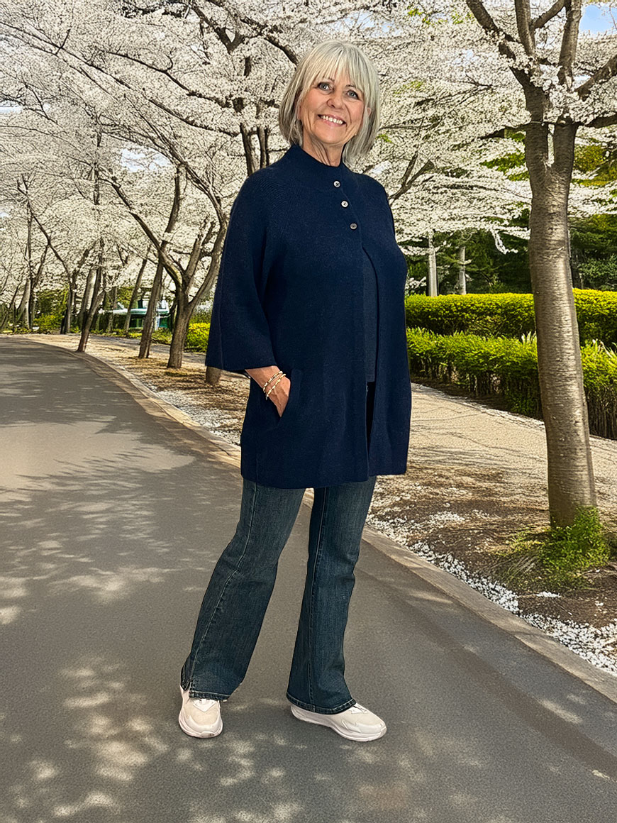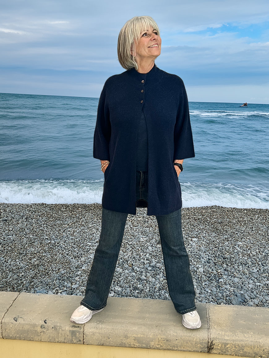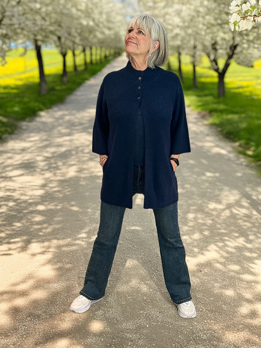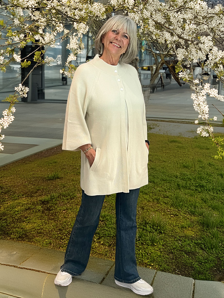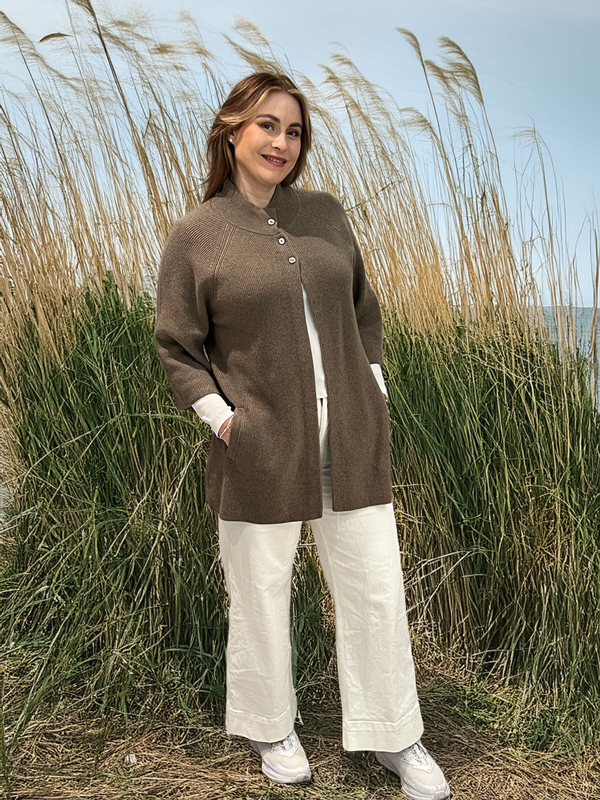 Med rund hals og tre dekorative knapper får cardiganen et tidløst uttrykk, mens de praktiske lommene gir funksjonalitet. Den lange passformen gjør den enkel å style – bruk den over kjole for et feminint preg, eller kombiner med jeans for en avslappet, men sofistikert look.