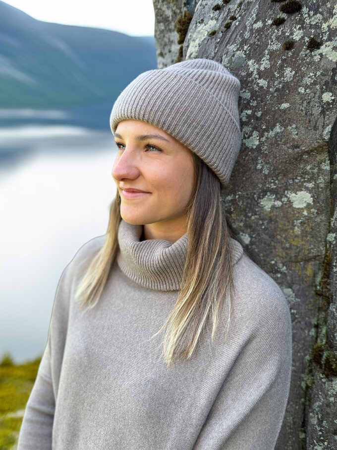 Opplev luksusen med vår ribbestrikkede lue, laget av 100% myk og varm kashmir. Denne eksklusive luen kombinerer stil og komfort, og gir deg både et sofistikert utseende og optimal varme. Den har et klassisk ribbestrikket design som gir god elastisitet, samt et generøst oppbrett som kan tilpasses etter ønske for ekstra komfort og beskyttelse mot kulden.