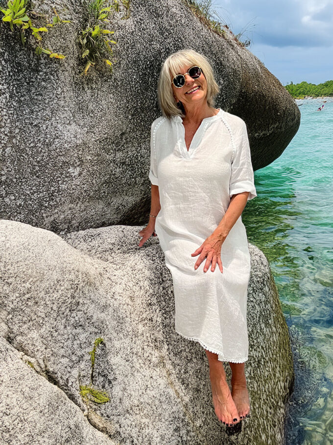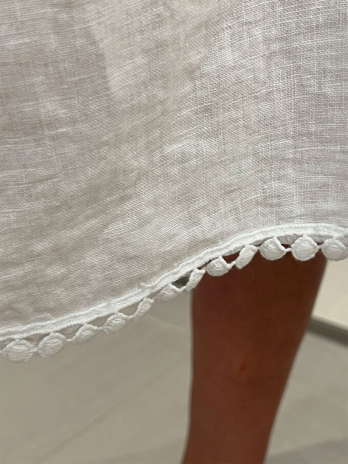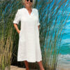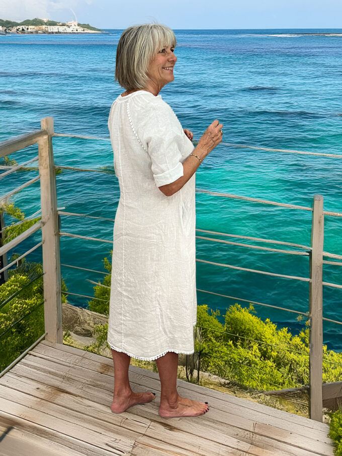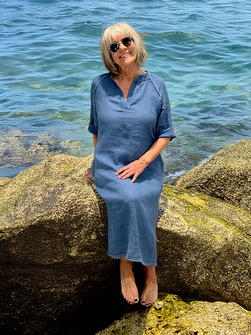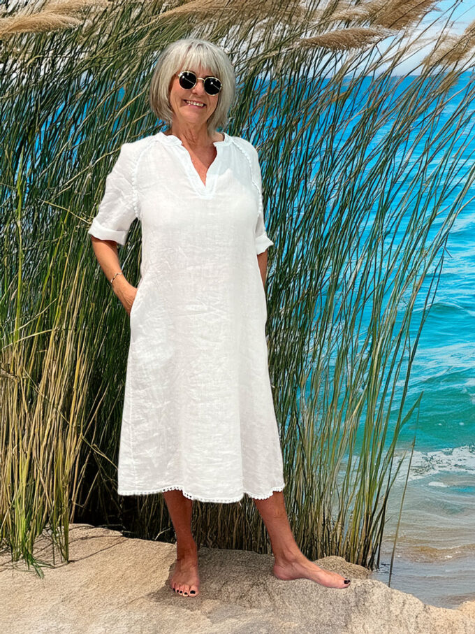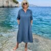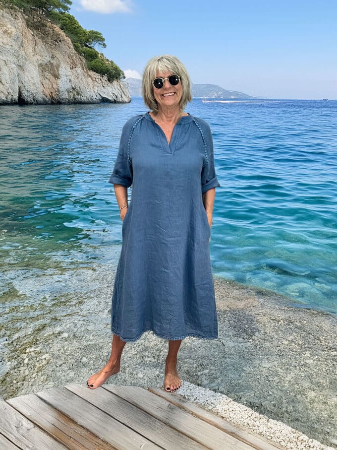 En tidløs og behagelig kjole i lett og pustende lin – perfekt til både hverdagsbruk og sommerdager. Det naturlige materialet gjør kjolen sval, komfortabel og elegant på samme tid.