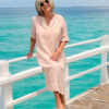 Kjolen har en feminin V-splitt i halsen og 3/4-ermer som enkelt kan brettes opp for en mer avslappet stil. Små dekorative detaljer langs skuldersømmen og nederst på skjørtet gir kjolen et fint og gjennomført uttrykk.