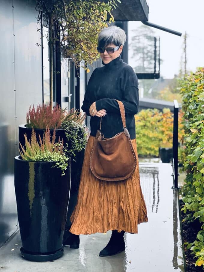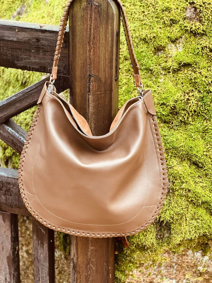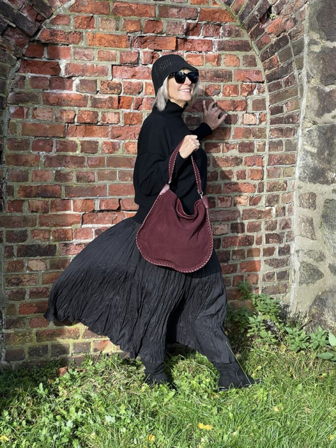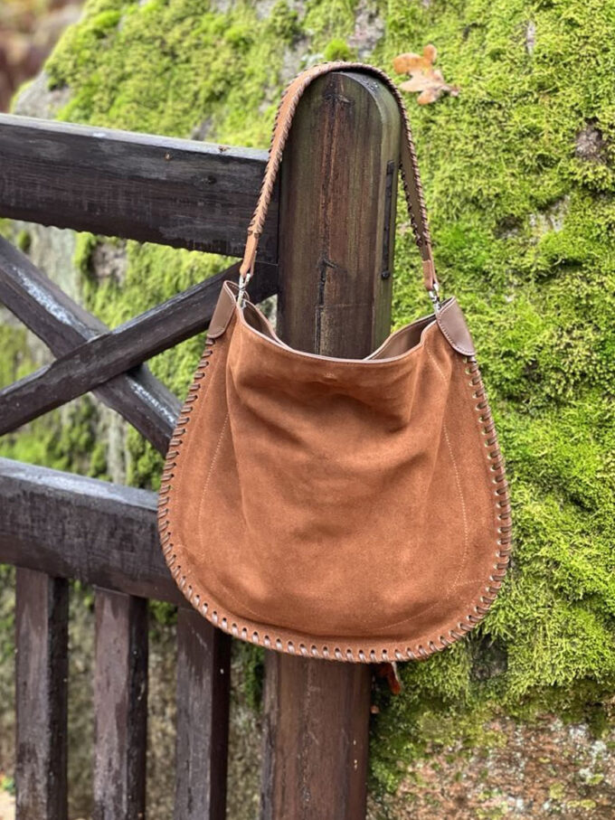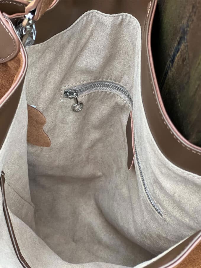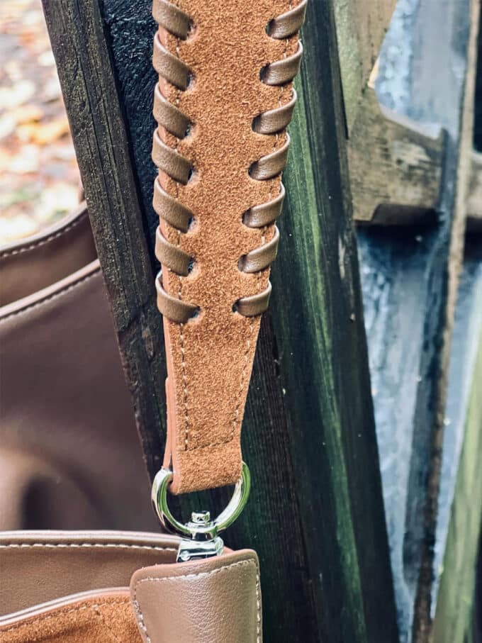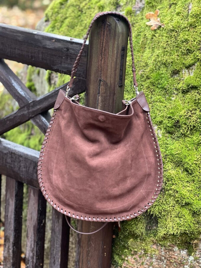 Denne stilrene skinnvesken kombinerer klassisk design med unike detaljer. Med en side i glatt skinn og den andre i mykt semsket skinn, får du et sofistikert uttrykk med en spennende kontrast. Den flettede skulderhanken gir et eksklusivt preg, mens den medfølgende lange skulderstroppen gir deg fleksibilitet til å bære vesken slik det passer deg best. Vesken har magnetlås og et lite rom inni med glidelås og et uten glidelås.