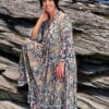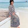 Kjolen kommer i vakre blåtoner og har elegante volanger nederst på ermene og nederst på skjørtet, som gir et lett og romantisk uttrykk. Den har en flatterende V-utringning med knapper ned til livet, noe som gir både et fint snitt og mulighet til å justere åpningen etter ønske.