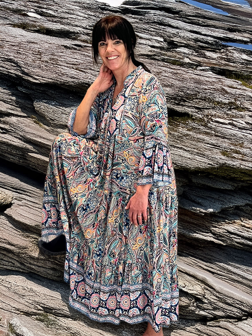 Lang viscosekjole i blåtoner
